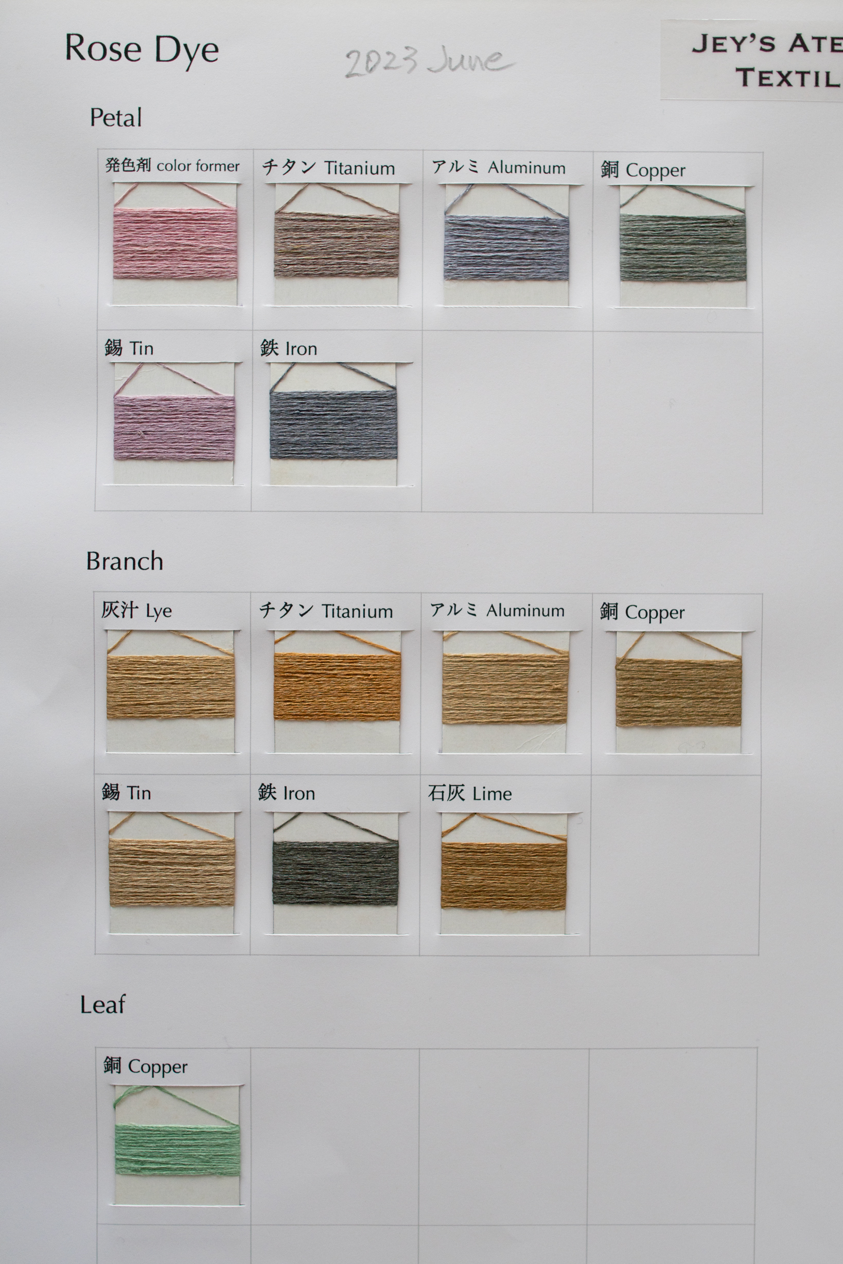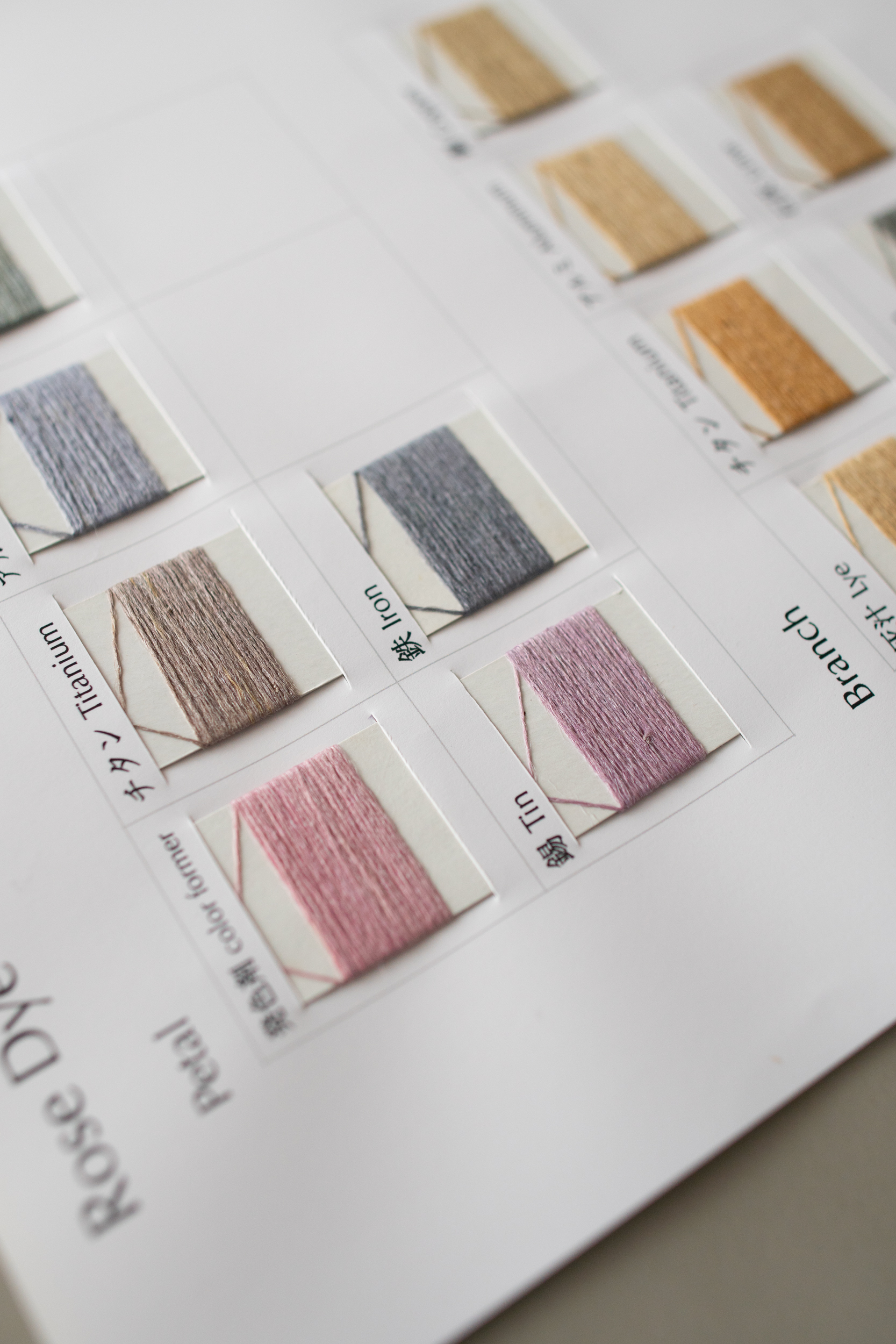 少量ずつ巻き取り、さっそく庭に咲いている薔薇の花びら、枝、葉で染めることにする。もつれそうになる束をゆっくり丁寧に。動作を繰り返しているうちに、だんだんと糸との対話がスムーズに運びだす。