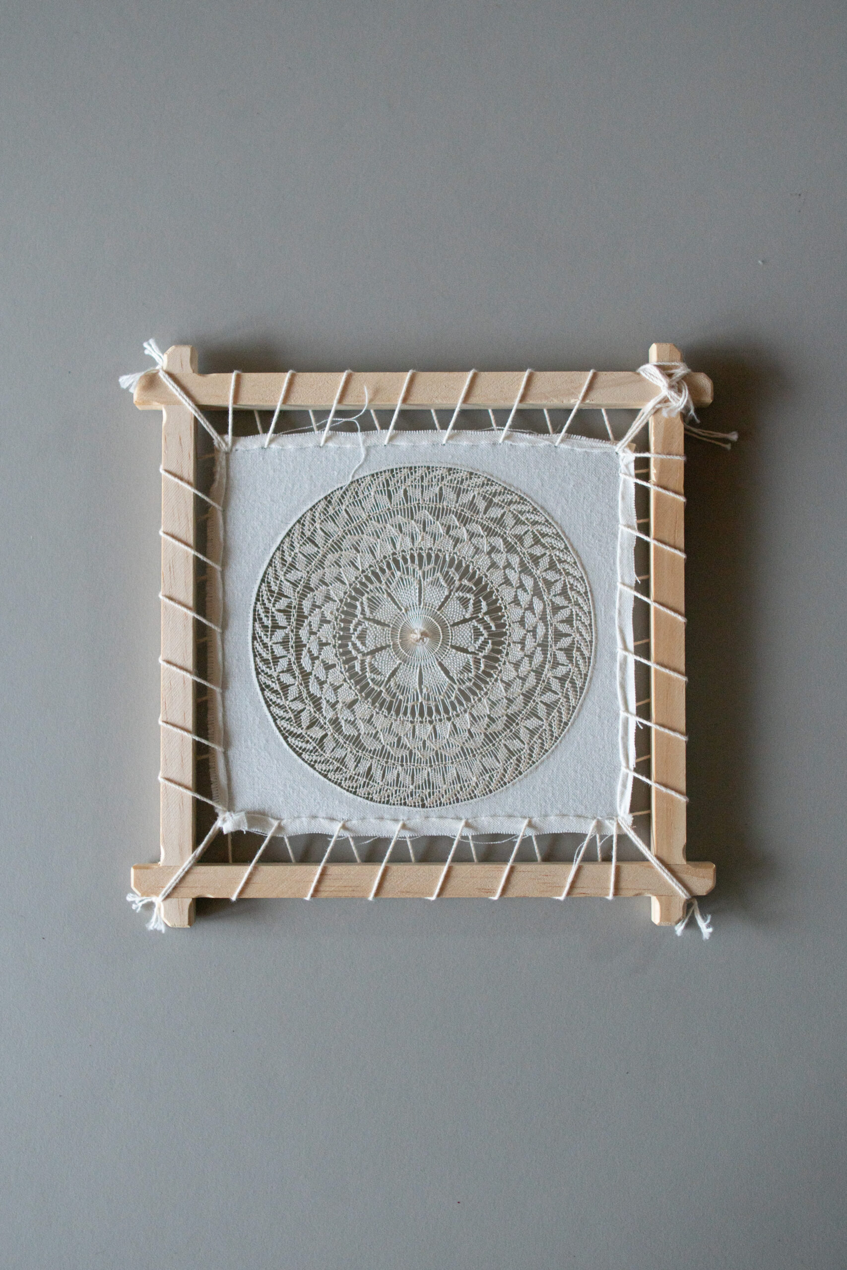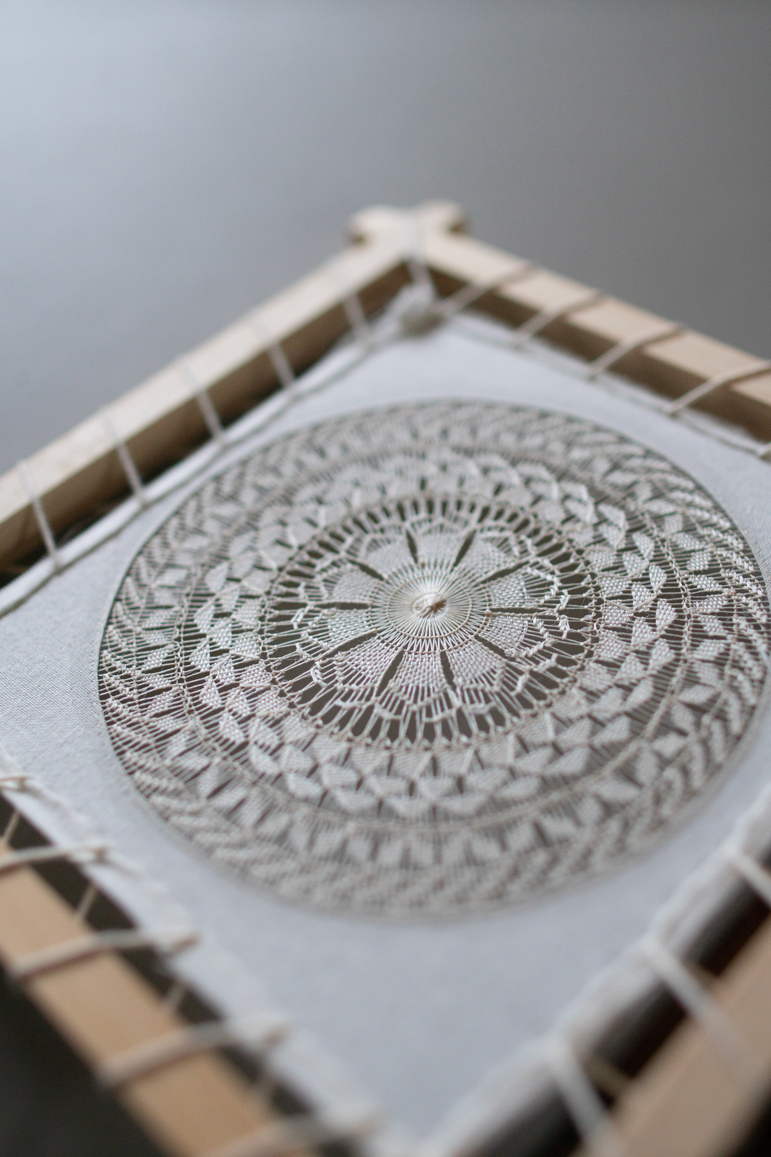ニャンドゥティは、抜け感があるモチーフも美しいですが、ワイルドシルク糸ですと、キチッと編み込んだ方が、より艶感がでて素敵でした。1本取りですと、細くヨリがないので、荒く編んでいくとどうしても平面的で単調になってしまうように感じましたが、枠付
